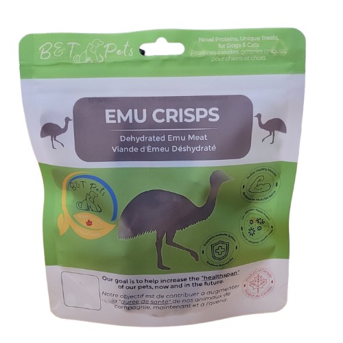 Our Emu Crisps feature 100% Canadian emu, which we ethically and sustainably raise in Southwestern Ontario as a single-ingredient treat. Dehydrated to human-grade standards, this lean, high-protein meat supports muscle health and is highly digestible, making it gentle on sensitive stomachs. Prepared in a human-grade facility and then finished in the B&T Pet kitchen, Emu Crisps are a clean and novel protein source. Therefore, they are ideal for both dogs and cats with sensitive diets.