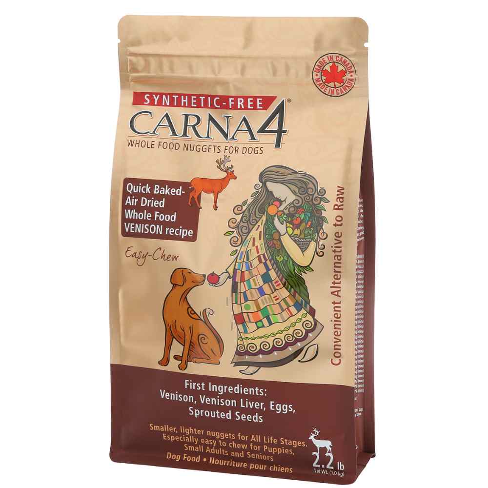 Carna4 Easy-Chew Venison Dog Food variety is whole food nutrition for all life stages of your dog customized with a slightly softer, smaller nugget – perfect for the little mouths of puppies and small breeds, as well as older dogs that have trouble with chewing. Carna4’s delicious air-dried nuggets are highly digestible and so densely packed with whole foods that you may need to feed 10-15% less per day than you are used to. Our venison formula is loaded with pastured New Zealand venison. New Zealand has some of the cleanest agriculture in the world and is a BSE-free country. We also include whole produce and our amazing mix of certified organic sprouted seeds that have been germinated to unleash a POWERHOUSE of NUTRIENTS naturally, to support your dog’s intestinal health, energy, skin and coat. We then quick-bake & gently dry it to give your dog bio-available vitamins and minerals, without synthetic additives of any kind. No vitamin pre-mix needed nor added, ever.