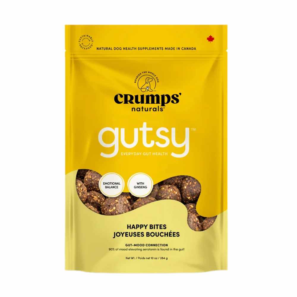 Crumps’ Naturals Gutsy Happy Bites Dog Treats help enhance mood and mental health with gut boosting prebiotics in every bite. Formulated with science backed ingredients like fermented yeast and powerful prebiotics to help naturally occurring good gut bacteria thrive. These tasty bites are infused with natural adaptogens like Ginseng and Boswellia, ensuring your pet’s well-being from the inside out. Why? Because 90% of mood elevating serotonin is found in the gut!