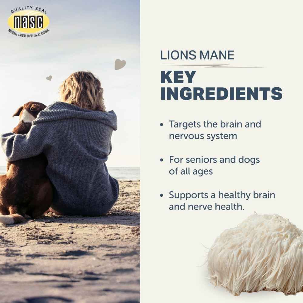 Lion’s Mane mushroom is rich in hericenones and erinacines, which can help support cognitive and neural function for dogs of all ages. This unique mushroom naturally targets the brain and nervous system: