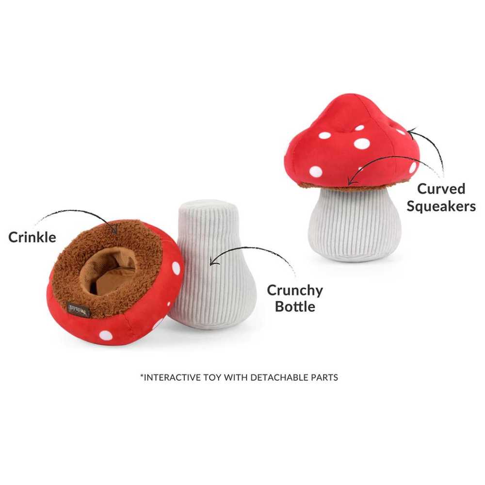 This mutt mushroom plush toy contains a crinkle, crunchy bottle, and curved squeakers for lots of magical mushroom fun.