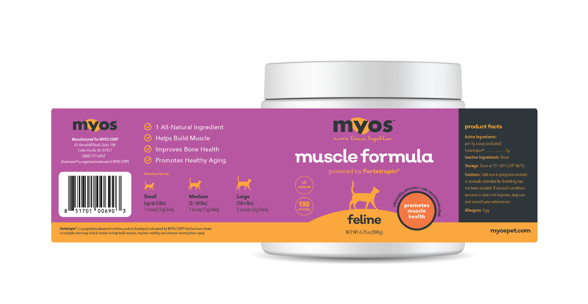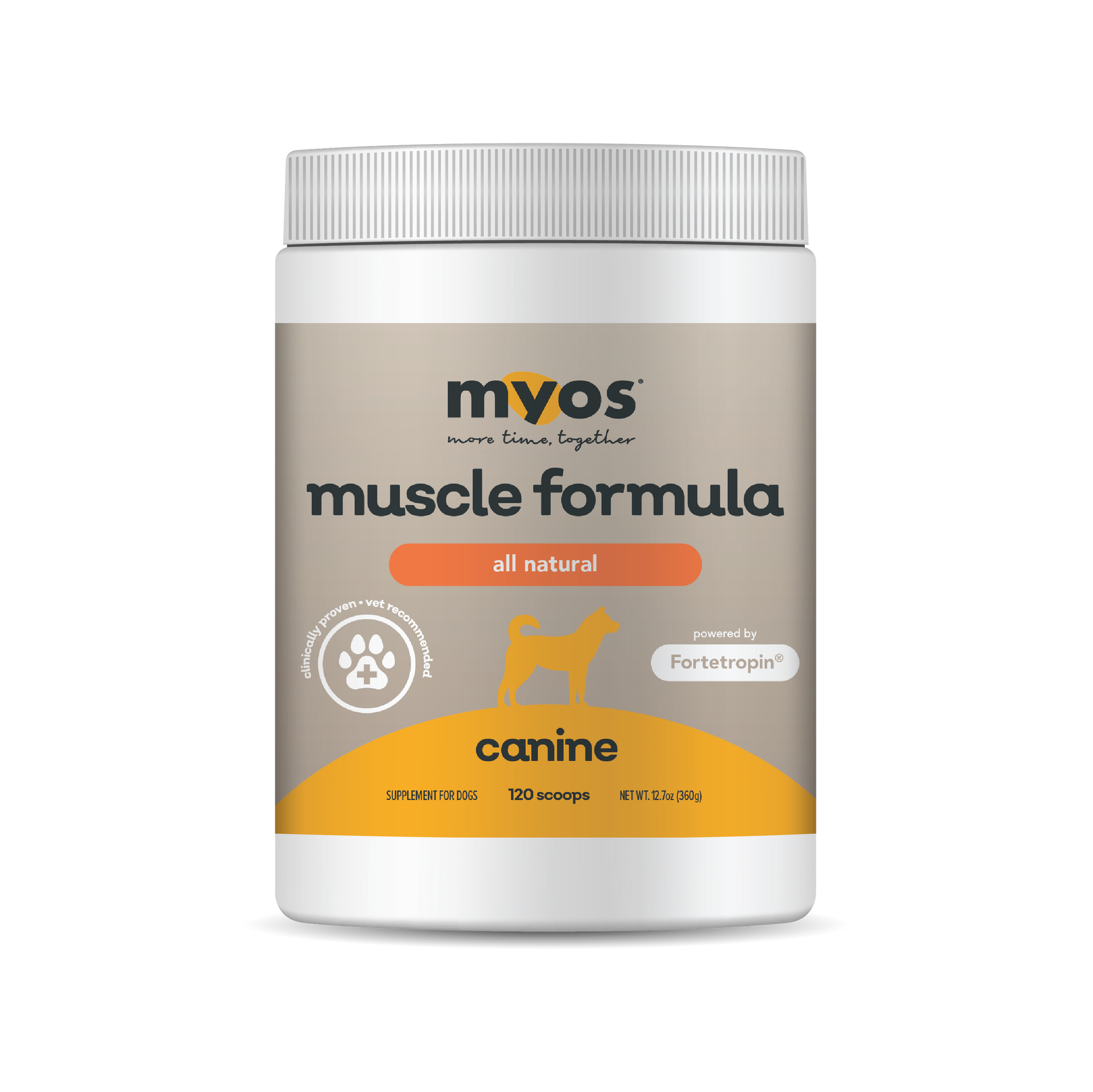 MYOS Muscle Formula (Canine and Feline) uses Fortetropin, which is clinically proven to build muscle and reduce muscle loss due to aging or injury.