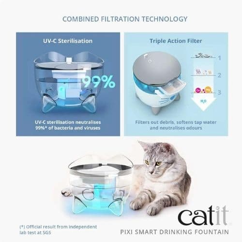 Cats need access to clean water to stay healthy, as proper hydration can help prevent urinary tract diseases. The Catit PIXI Smart Fountain features two filtration technologies for ultra-clean, great-tasting water.