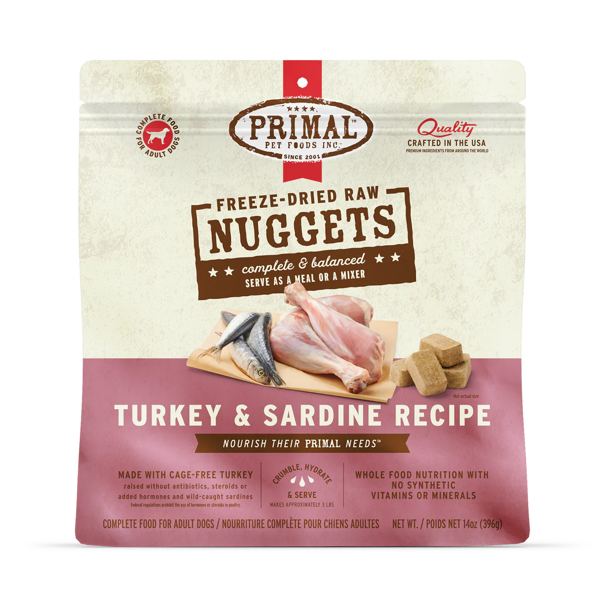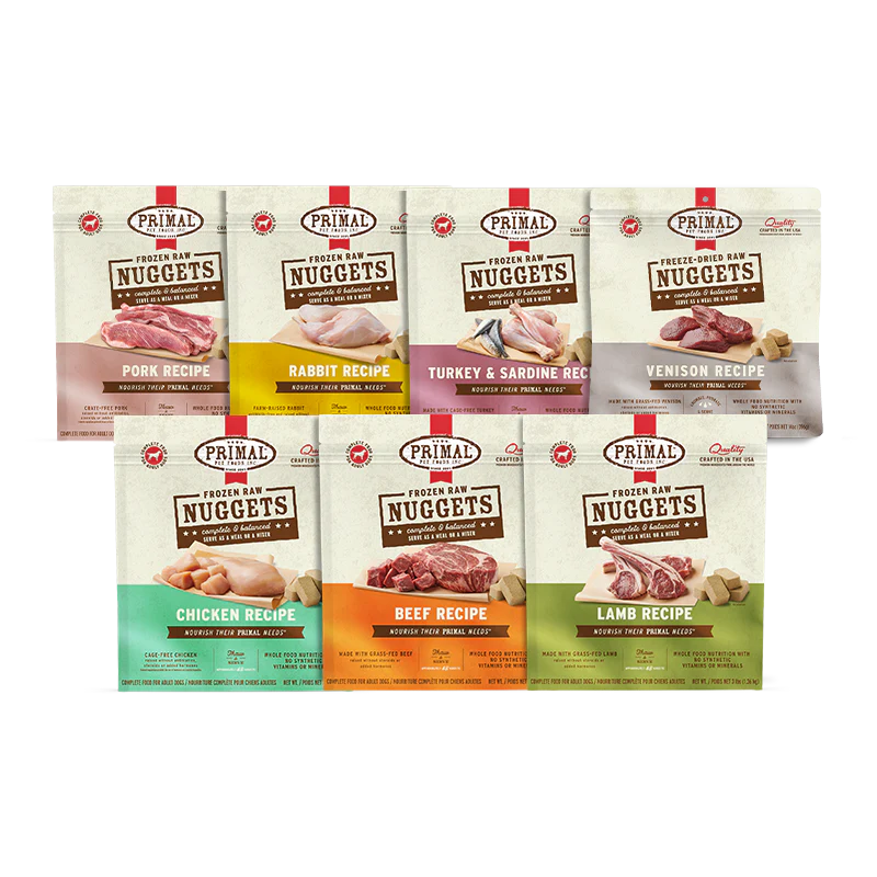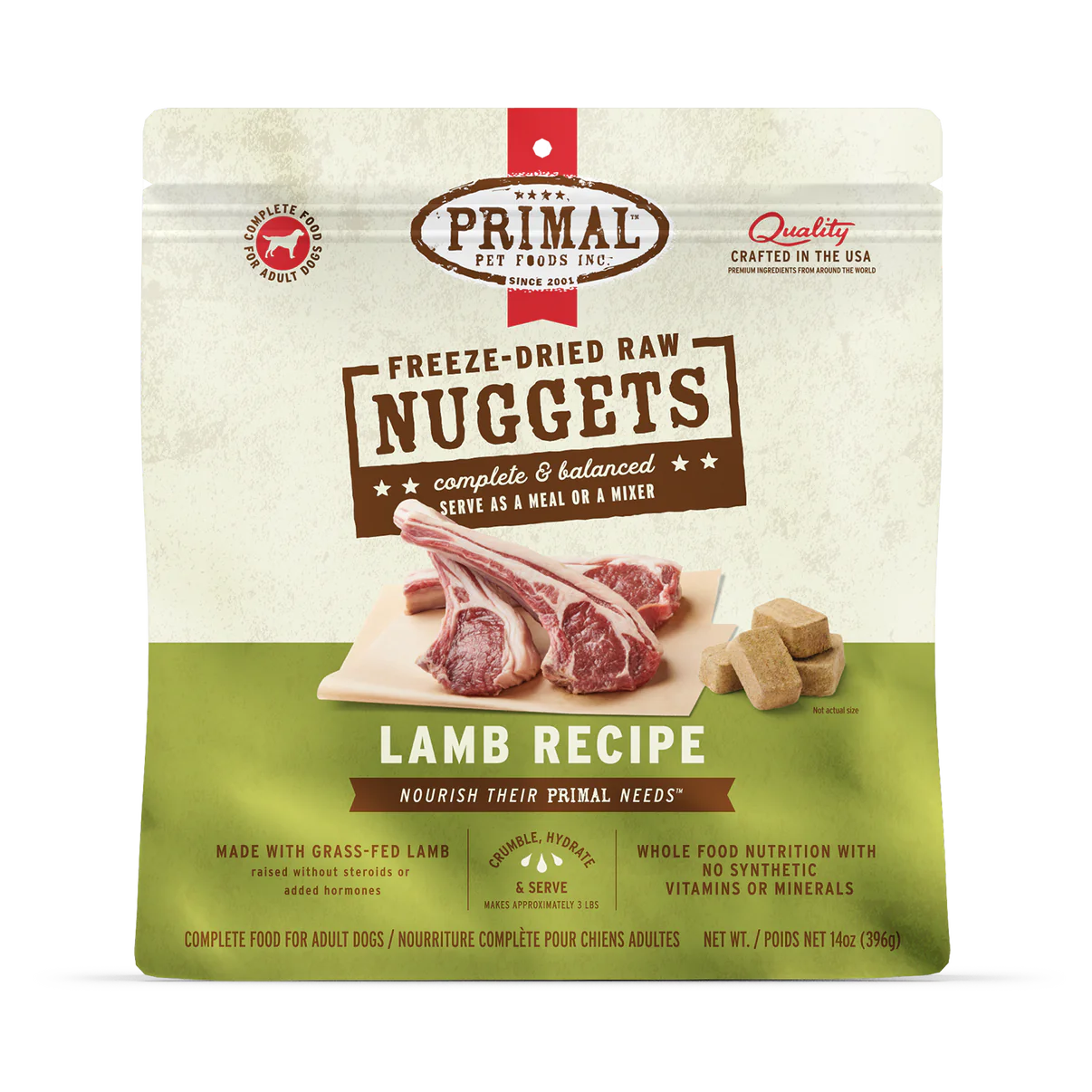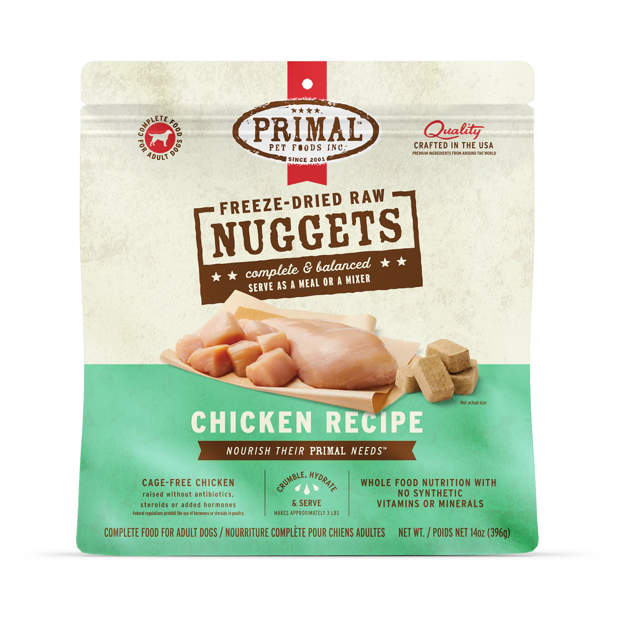 Rehydrate food with warm water, Primal Bone Broth, or Primal Raw Goat Milk to ensure optimum nutrient absorption. We recommend thoroughly incorporating one tablespoon of hydration for every nugget served.