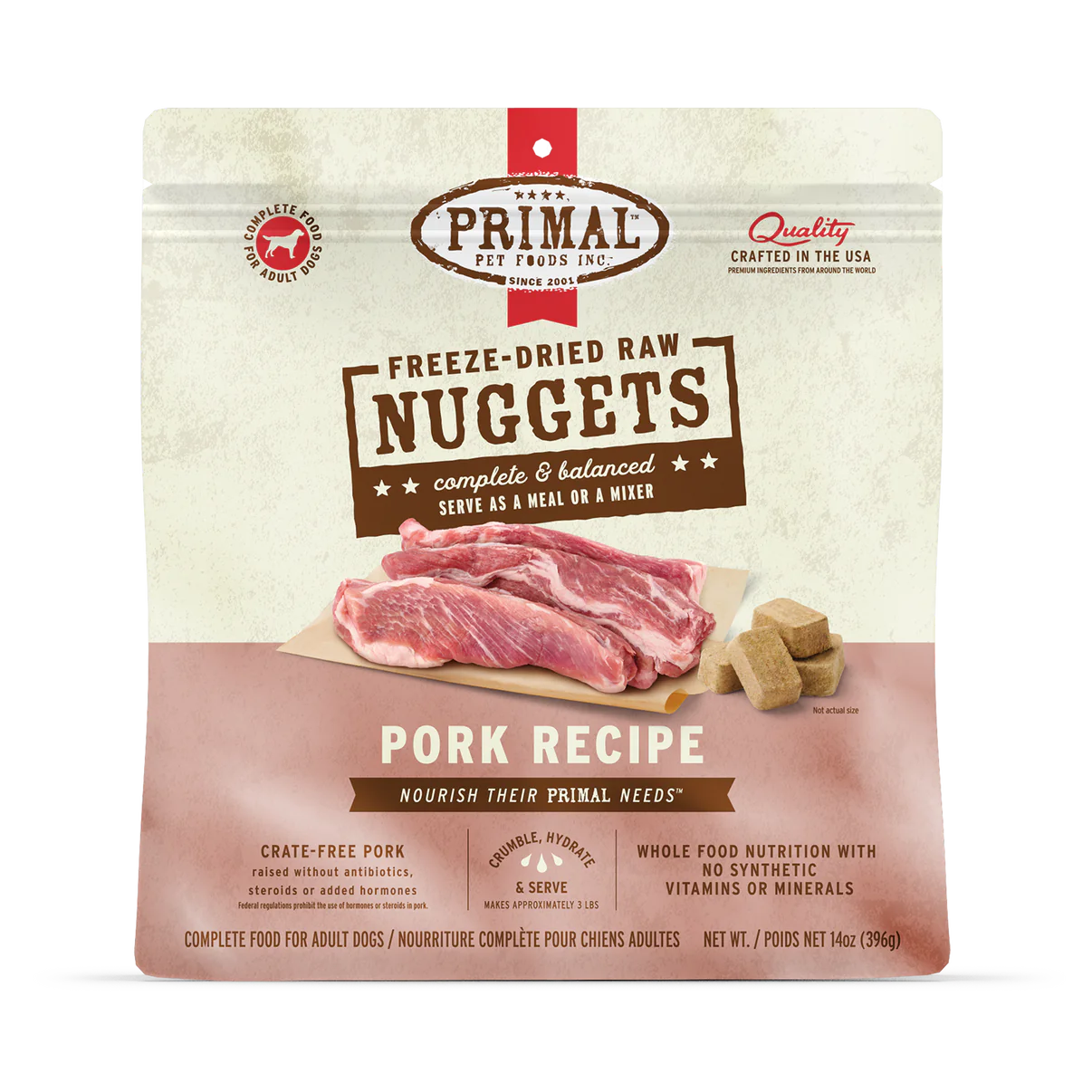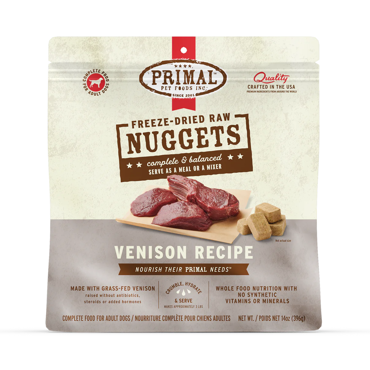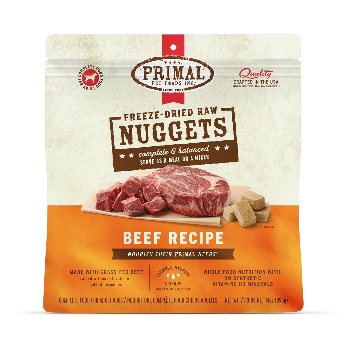 Primal Freeze-Dried Nuggets are shelf-stable and ready to serve in minutes—just portion, shred, and rehydrate with warm water, Bone Broth, or Raw Goat Milk.