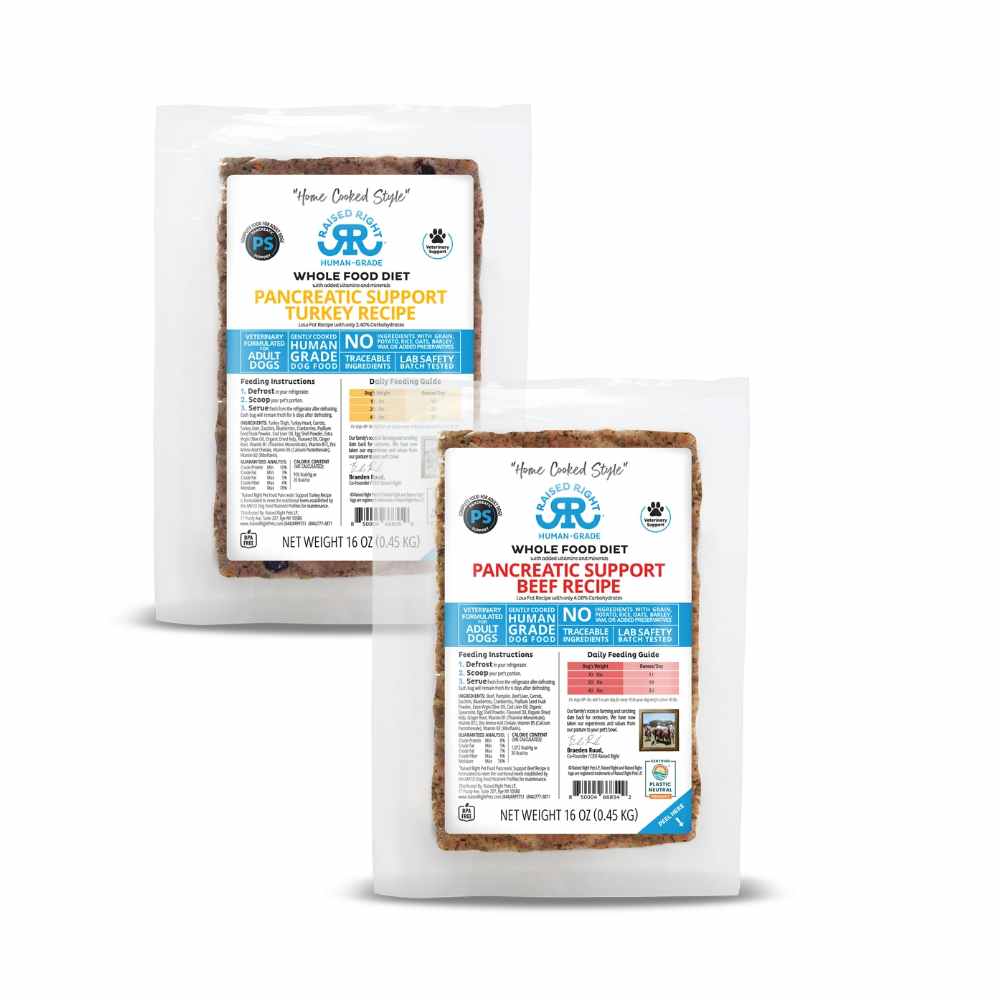 Not only has Raised Right created fresh low phosphorus recipes formulated for kidney support, but they’ve also created fresh low fat recipes formulated for pancreatic support.