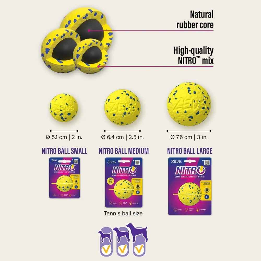 Zeus Nitro Ball takes your dog’s playtime to new heights with a perfectly weighted ball that flies higher and bounces further than ever before.